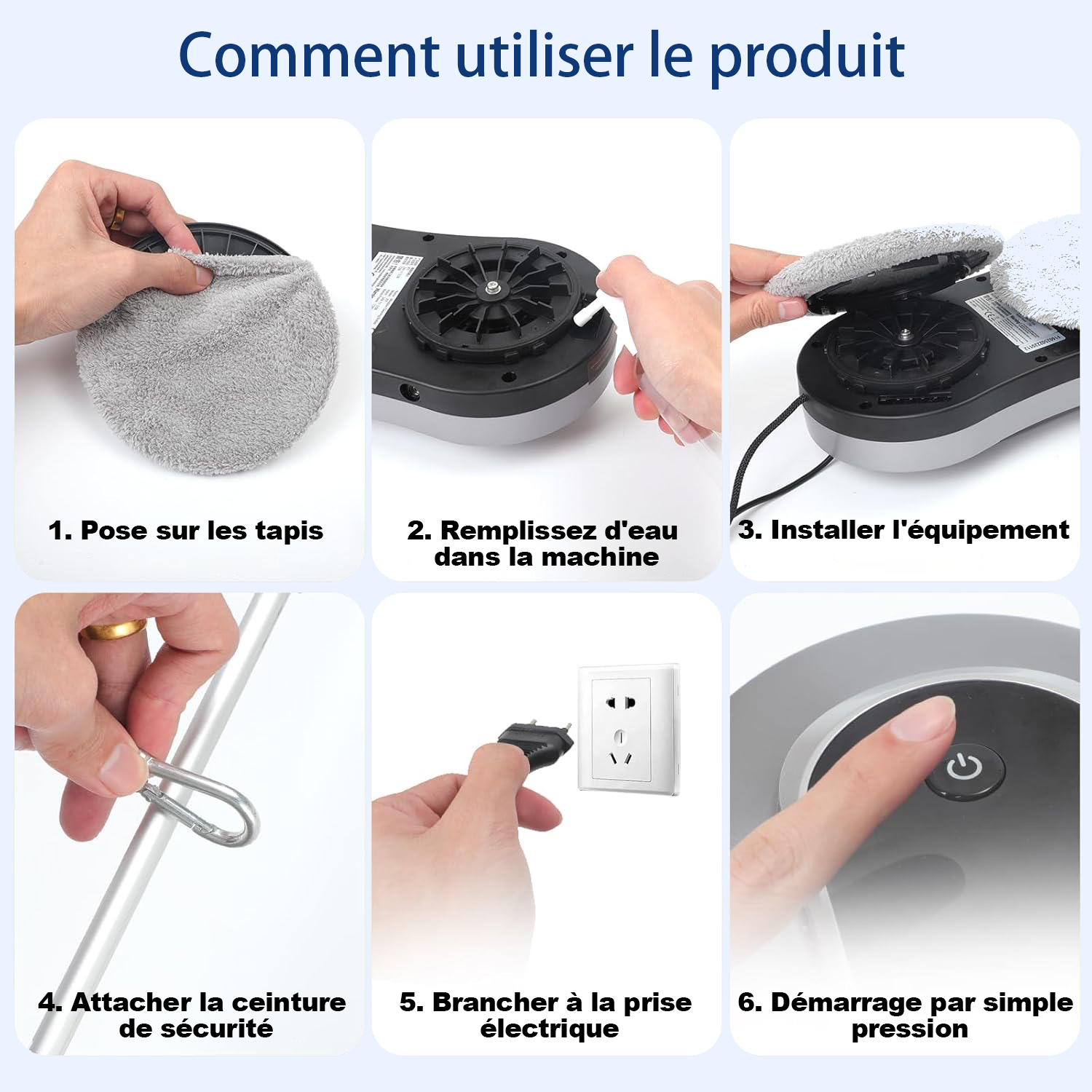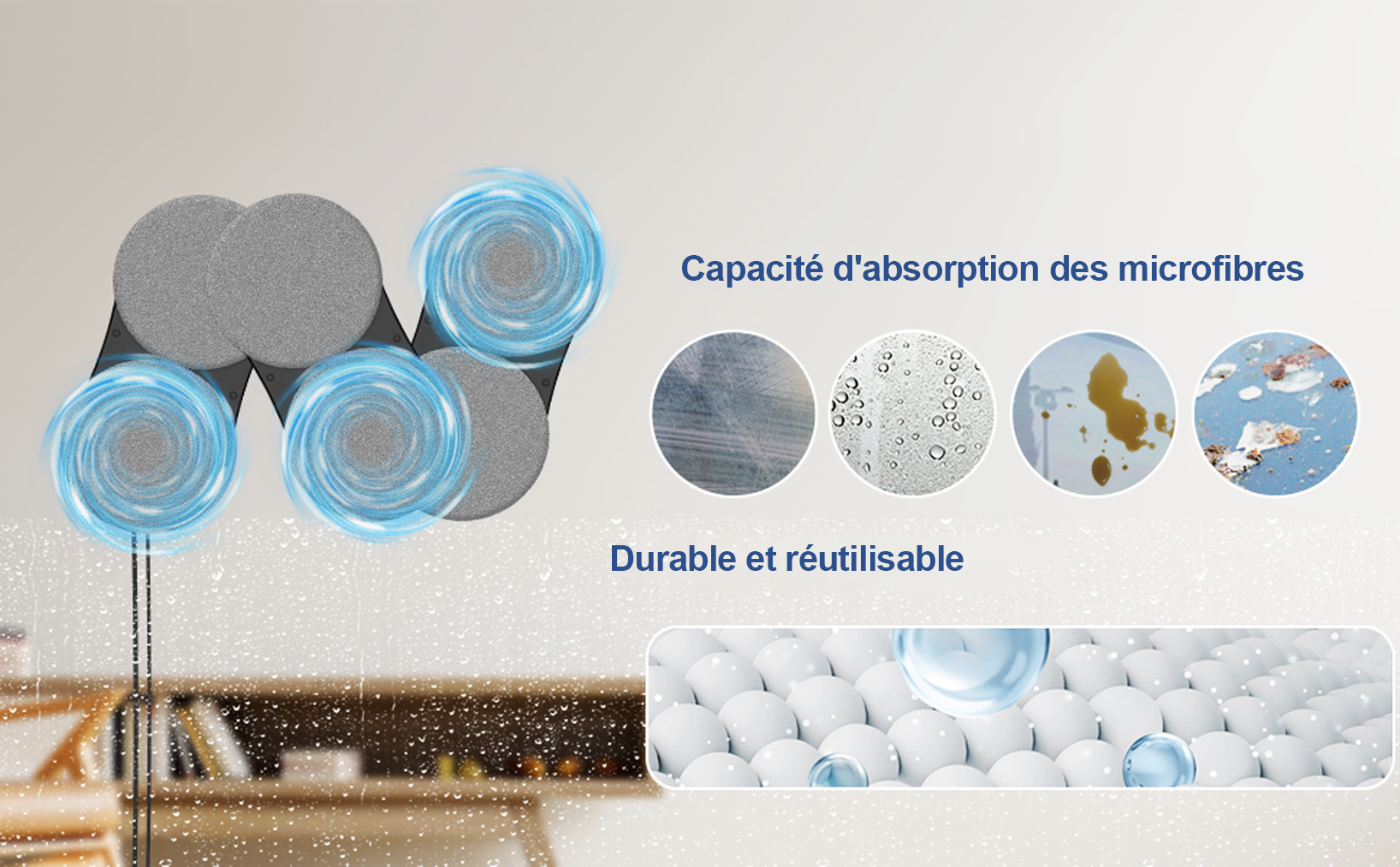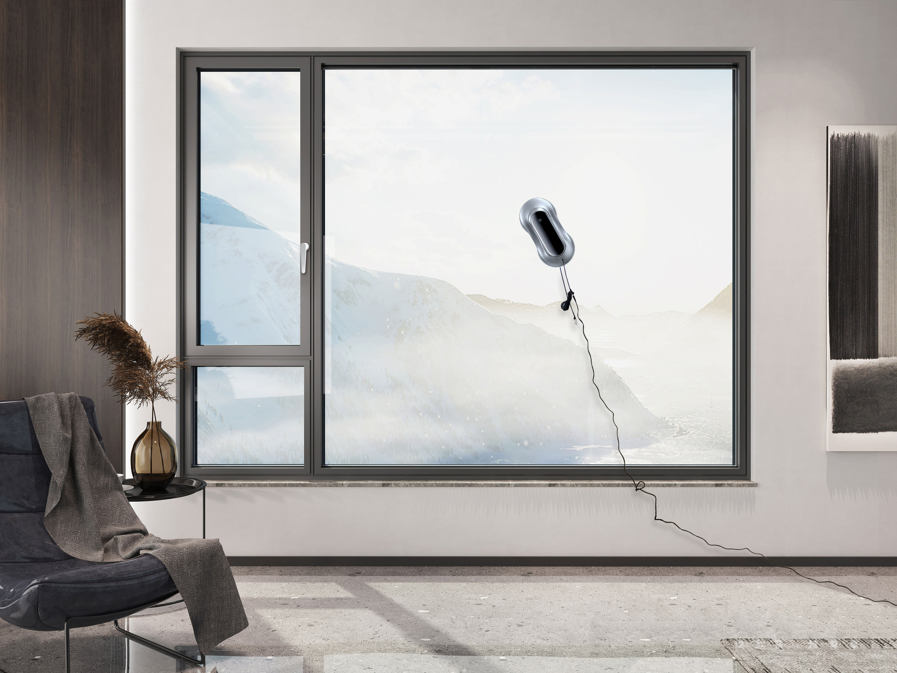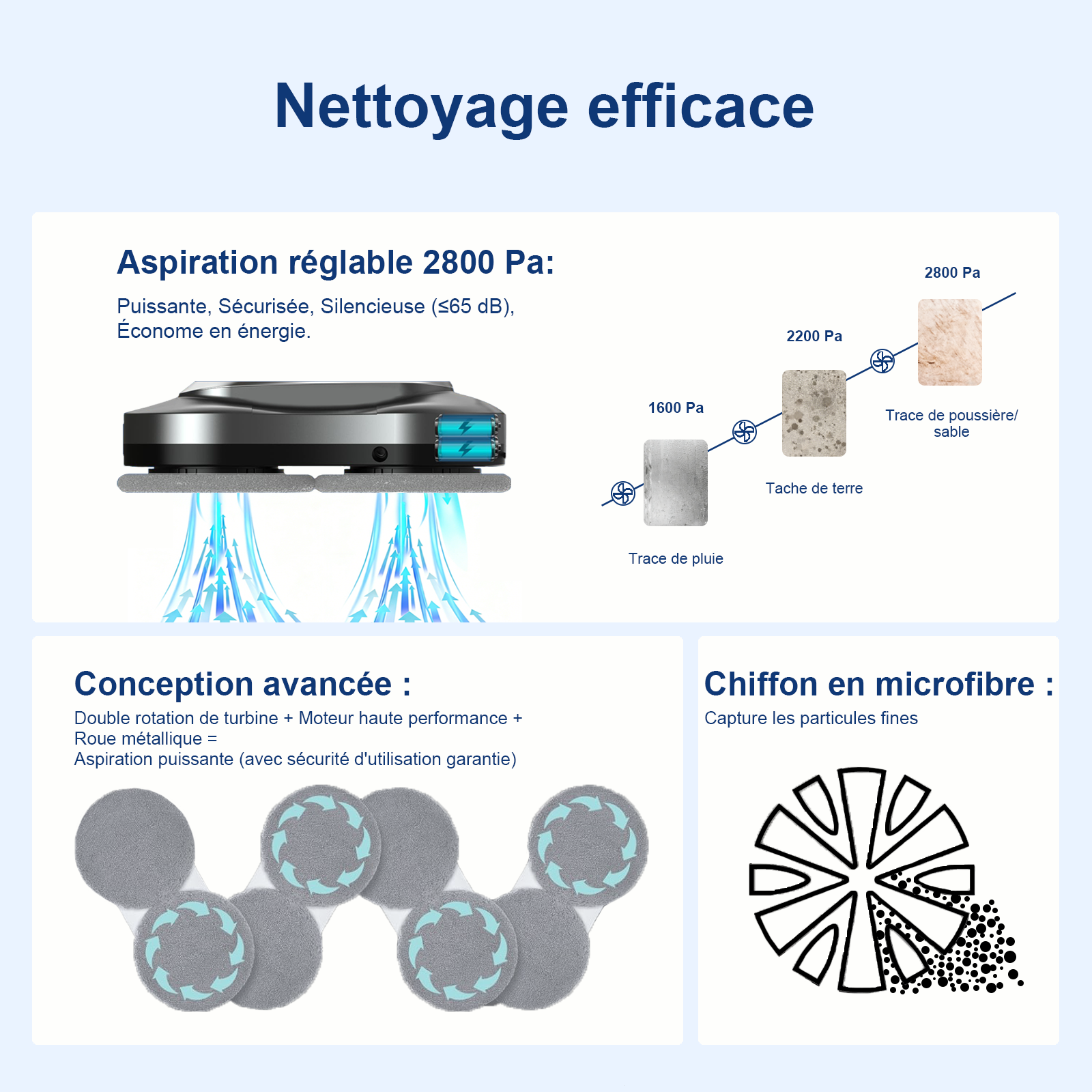 "Utilise une technologie d'adsorption puissante pour assurer une fixation ferme à la surface vitrée pendant le nettoyage sans risque de chute. Puissance d'aspiration à fréquence variable : 2800-3200 Pa."